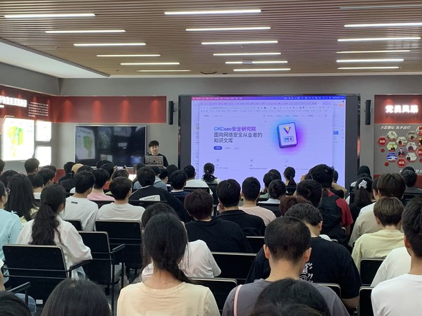 在天融信总部,校企合作部经理刘阳向师生系统介绍了企业发展历程,重点展示了“云·融·数·智”四位一体的业务架构,并深入解析了“AI+安全”智能防御体系的前沿技术。
