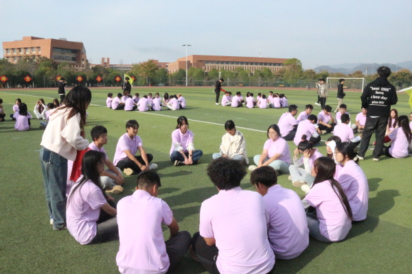 通过“破冰起航”和“团队竞赛”两个环节,同学们敞开心扉、积极活跃,整个现场一片欢腾。在静态热身环节主教练丁飞运用“时空穿梭”这个游戏,让同学们卸下拘束和腼腆,迅速燃起了青春的火力。在动态热身中,同学们在足球场中圈围绕在一起,时而多人抱团,时而转向加速,一首“爱的拥抱”让同学们的状态迅速进入高潮。静态与动态相结合的热身环节给大集体的第一项挑战带来了信心,在丁飞的耐心指导下,同学按照口令“1、2、3、坐!”完成了今天的首次挑战“信任后坐”,全场响起热烈的掌声。