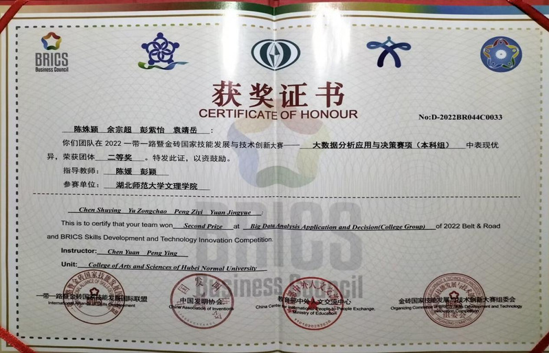 在2022带路暨金砖国家技能发展与技术创新大赛大数据分析应用与决策赛项(本科组) 获团体二等奖