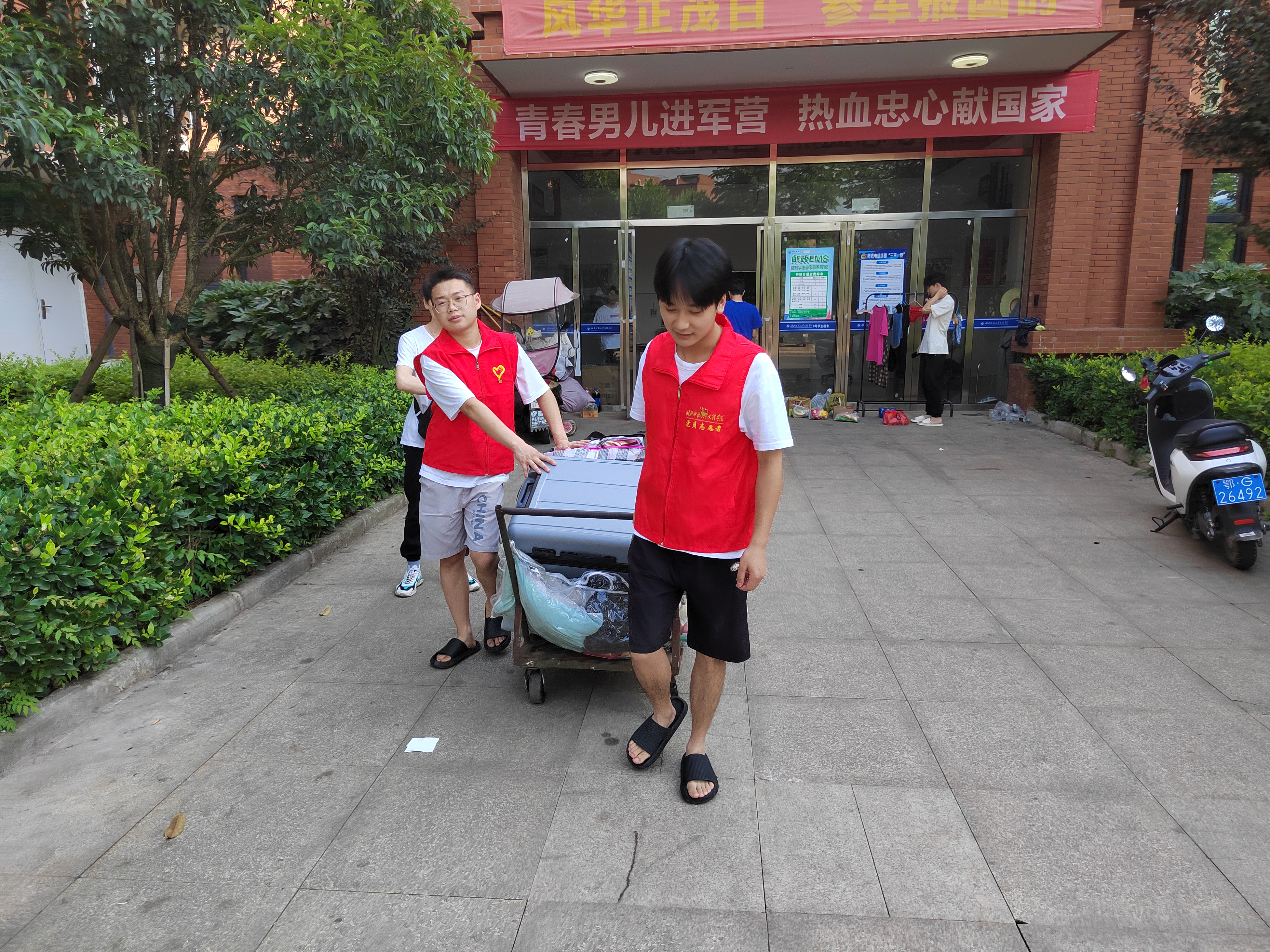 由于毕业生宿舍楼距离校门较远,毕业生们的行李较多,搬运不方便,理工学部学生党支部党员组成搬运小队帮助毕业生们将打包好的行李搬运至快递站和学校校门口,努力解决毕业生们大件行李寄存运输困难的问题,让即将离校的毕业生们深切地感受到了来自党支部的温暖与关心。炎炎夏日,党员志愿者们的脸上满是汗水,即使打湿了衣裳,却没有一个人喊累,更没有停下脚步。