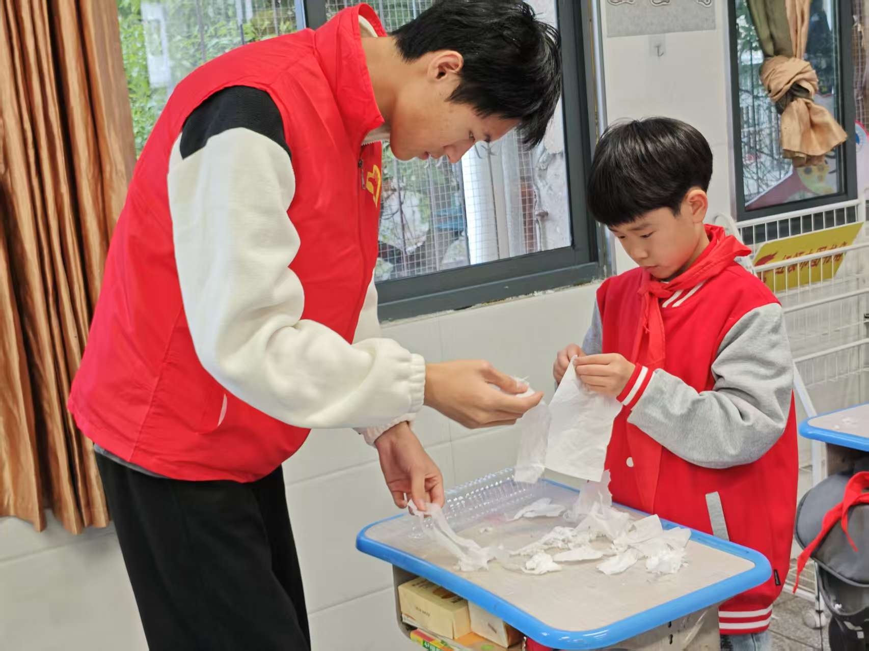 本次活动聚焦两大趣味实验,志愿者让孩子们在动手实践中解锁科学奥秘。“生活中的扩散现象”实验以红墨水扩散为核心,通过情景引入、动手操作,带孩子们发现饭菜飘香、颜料溶于水背后的科学原理,读懂扩散现象在生活中的广泛应用;“伯努利原理的奇妙世界”则用“空气小精灵”的趣味比喻,将抽象原理转化为通俗口诀,搭配塑料瓶、羽毛等材料的动手实验,既能揭秘飞机飞天的奥秘,更能结合高铁站安全规则传递实用知识,让科学学习充满乐趣与意义。