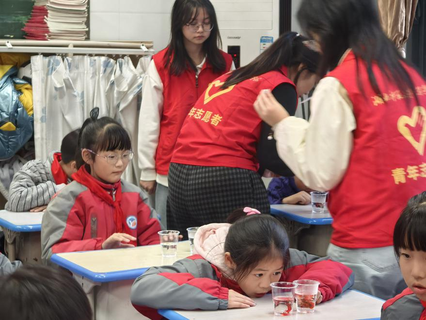 活动前,志愿者们精心筹备实验材料,针对两个班级分别设计了“生活中的扩散现象”“伯努利原理的奇妙世界”两大趣味实验。在“红墨水扩散”实验现场,志愿者通过情景导入引导同学们思考“为什么墨水会让水变色”,随后带领大家分组操作,观察红墨水在不同温度水中的扩散速度。“原来饭菜飘香、花香四溢都是扩散现象!”401班的彭于晏看着杯中逐渐变红的清水,兴奋地和同桌分享,“这个实验让我发现,科学就藏在我们身边。”