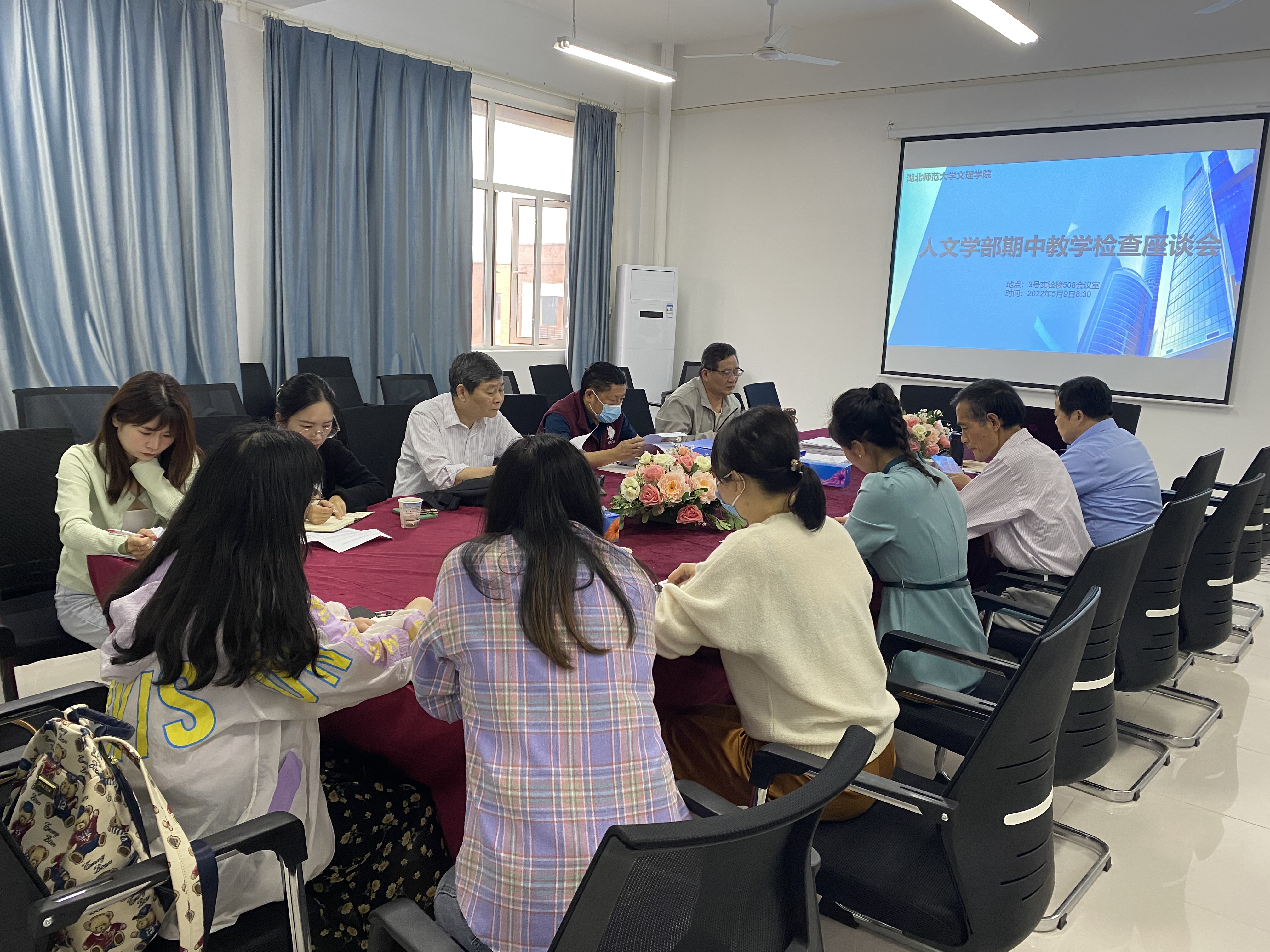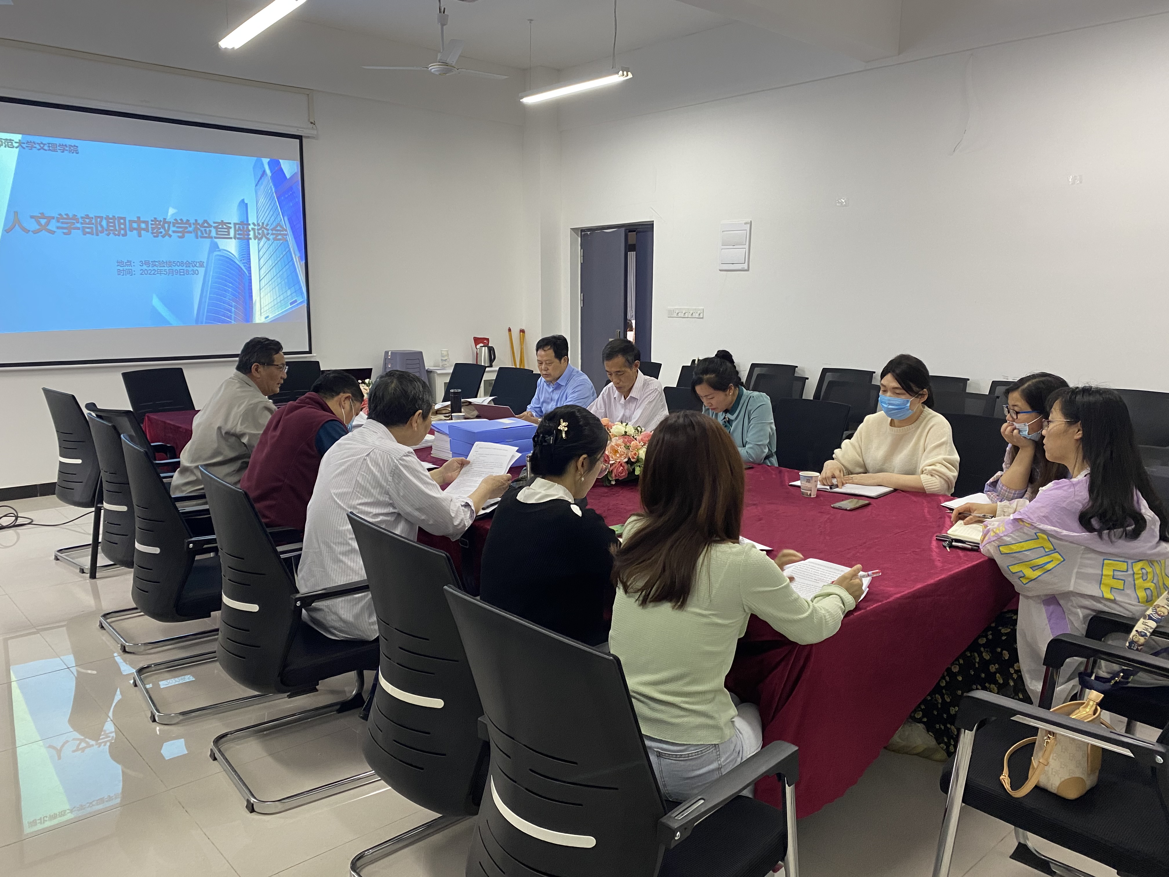 2022年5月9日上午八点半,人文学部在3号实验楼508会议室组织召开了本学期期中教学检查座谈会,参与此次会议的有文理学院常务副校长杨学斌、教务部部长潘继斌、教学督导董武世、教务部黄蓓佳老师、人文学部主任熊子延、学部副书记汪玉宝、各专业负责人及教研室主任、学部教学秘书和行政秘书。