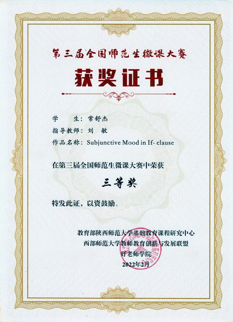常舒杰在第三届全国师范生微课大赛中荣获三等奖