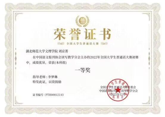 刘京菁在“2022年全国大学生普通话大赛”中荣获本科组全国一等奖