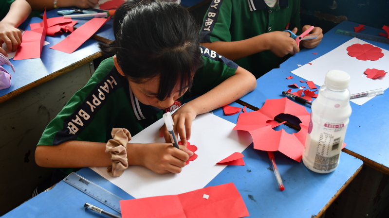 生动课堂,情暖心间。上午9时,学生党员尹雪倩同志围绕日常安全问题,心理健康状态等方面对同学们进行了生动精彩的讲授。随着小课堂PPT逐步深入的引导,同学们听讲和举手答问的积极性显著提高。游戏互动环节,学生党员覃如苗同志带领学生们进入“巧手小课堂”——送你一朵小“红”花。学生亲手参与制作花朵和贺卡,送给自己最重要的人,记录下送花时的感受和祝福。为间接了解近期学生的心理状况,尹雪倩同志让小朋友们把自己的烦恼写在小纸条上并投入纸盒子里,带领学生分享感受,并鼓励他们珍惜时光、发奋学习,同学们接过满载爱心的礼物,脸上洋溢着幸福的笑容。