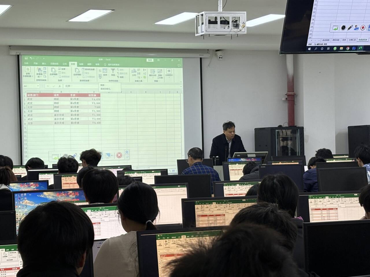 毛教授以“excel表格分析”为主题,通过案例导入、任务驱动和互动讨论等多种教学方法,将理论知识与实际应用紧密结合。课堂上,毛教授通过演示操作、学生动手实践等环节充分调动学生积极性,展现了扎实的专业功底和娴熟的教学技巧。听课教师全程专注记录,对课堂设计、师生互动及信息化教学手段的应用给予了高度评价。