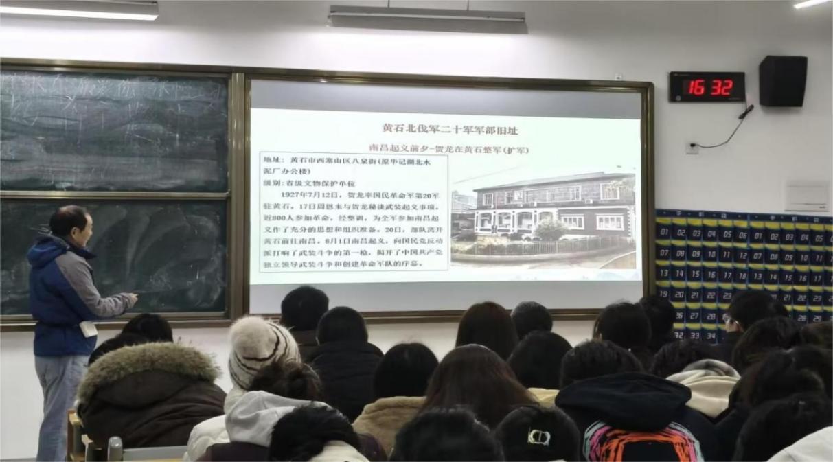 除此之外,傅教授还详细讲述了毛泽东主席两次视察黄石市的故事、介绍了黄石的红色遗迹,如:小红楼、红军楼、黄石市区、大冶市区和阳新县城的红色革命旧址。通过一幅幅珍贵的老照片和详实的文献资料,带领同学们穿越历史时空,重温黄石城市发展的峥嵘岁月。