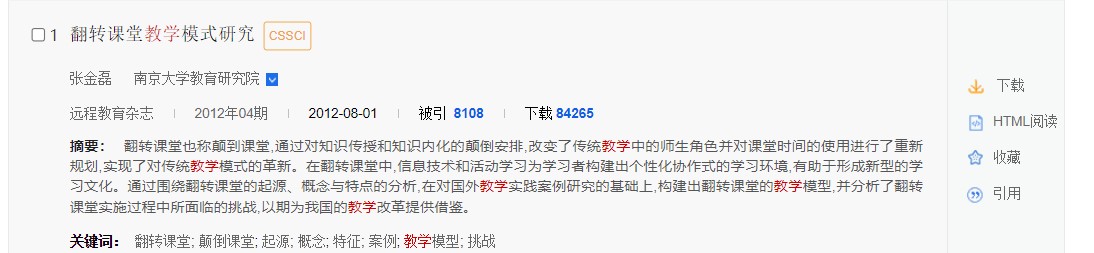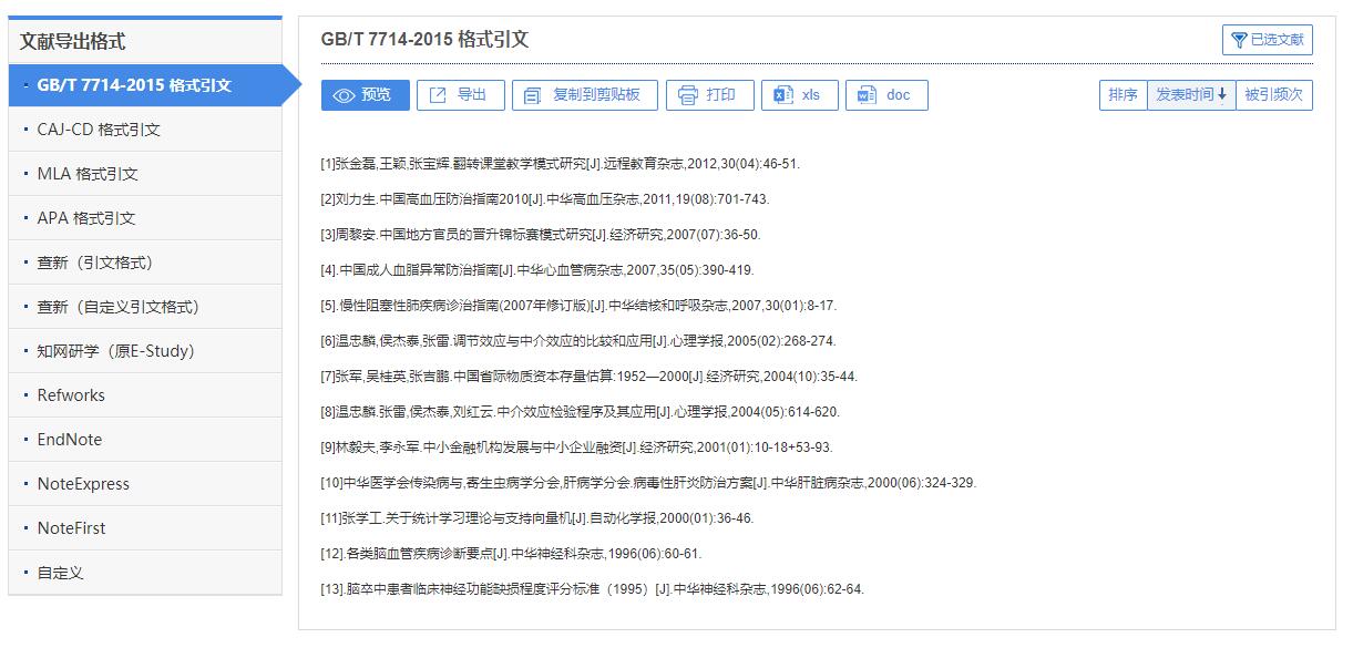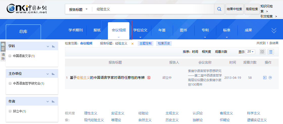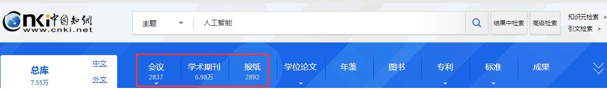 总库检索后,点击各资源类型名称,下方的检索结果区即为该资源类型文献。