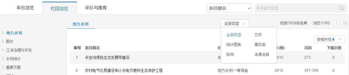 如图5.8.6.3所示,左侧默认展示该年鉴的一级栏目信息。右侧为该栏目下的条目列表,包括条目题名、栏目名称、年(卷)、页码、下载次数。同时可以筛选条目类型,如文件、统计图表、事实类、机构、法律法规等类型。默认按照相关性排序,还可以按年鉴年份、按下载次数排序。点击题名,可进入相应条目知网节;鼠标悬停到某篇文献,点击按钮可下载(登录后)、在线预览、分享该篇文献。