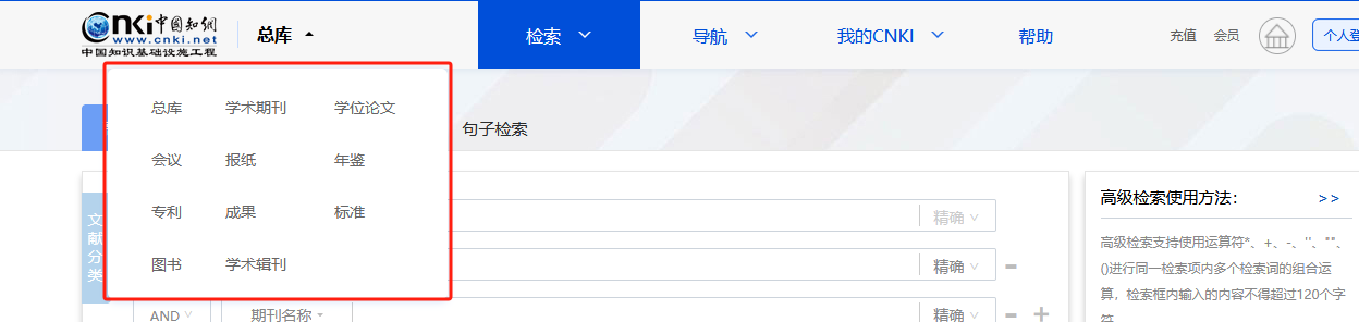 (3)在首页点击“高级检索”,在高级检索页面下方切换数据库进入单库高级检索。