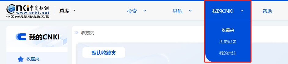 鼠标移入页头“我的CNKI”,显示收藏夹、历史记录及我的关注,个人登录后,点击进入相应页面。