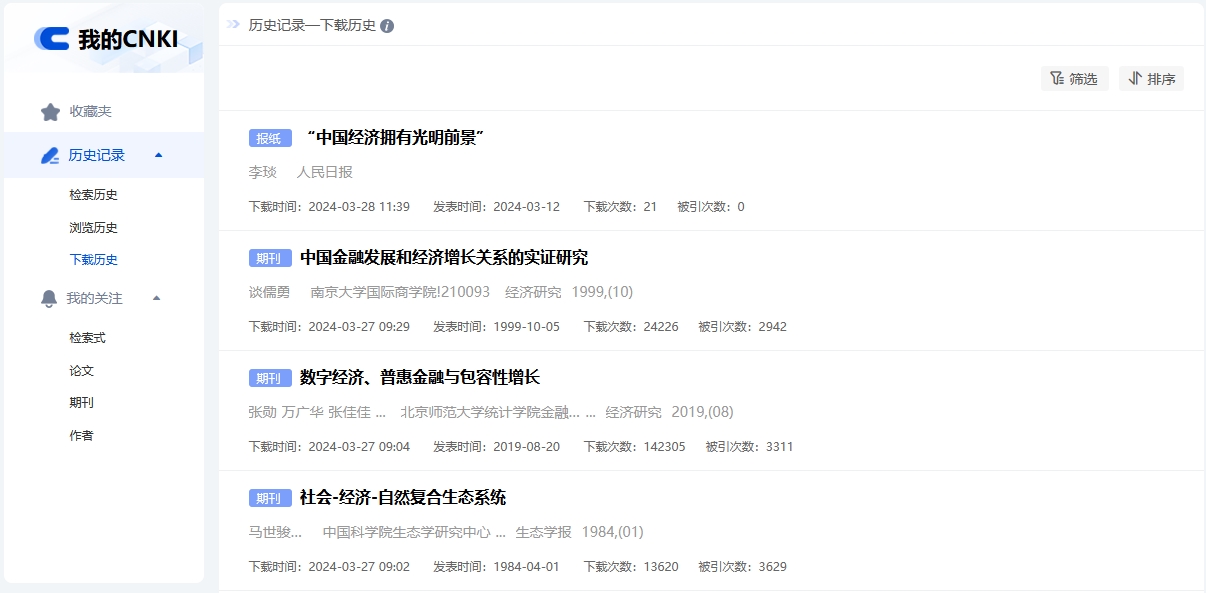 下载历史为PDF下载、CAJ下载、HTML阅读、在线阅读的记录,显示已下载文献的类型、题名、作者、机构、来源等信息,支持按下载时间筛选或排序。点击文献标题,跳转至该文献知网节页面。鼠标悬停到某篇文献,点击按钮可下载或收藏该篇文献。