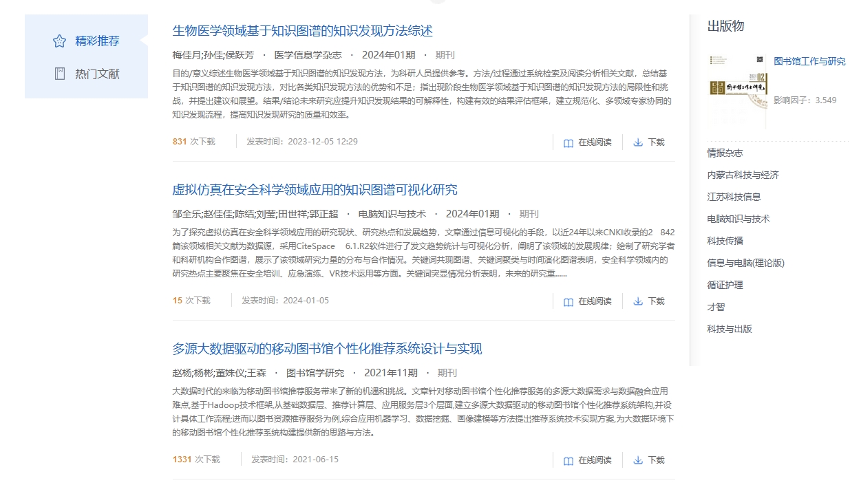 (8) 新增个性化推荐系统,集精彩推荐和热门文献于一体,版面占据总库平台及各单库的首页面,我的关注与个人账号关联,满足用户个性化需求。