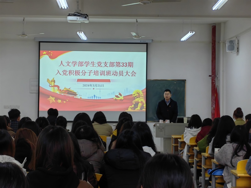 为进一步端正人文学部学生党支部入党积极分子的入党动机,保持基层党组织生机与活力,切实把握好党员队伍的“入口关”和“质量关”,在校党委、人文学部党总支的部署和指导下,人文学部于2024年3月25日12时20分在3号实验楼420教室召开第33期入党积极分子培训班动员大会。人文学部党总支部书记周景斌老师、学生第一党支部书记高悦老师、学生第二党支部书记郭旭林老师出席大会。