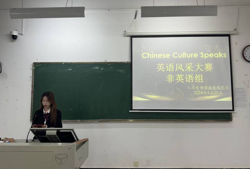 英语作桥梁,文化传世界。为丰富校园文化生活,创设良好的英语活动氛围,提升同学们对英语学习的兴趣,给学生提供展示个性、发挥特长、展现英语风采的平台,人文学部于4月25日晚在教学楼1A201、1A203举办以“Chinese Culture Speaks”为主题的英语风采大赛。此次活动旨在激发大学生对祖国、对中华传统文化的热爱之情,提升学生的文化自信,传递中国文化正能量。