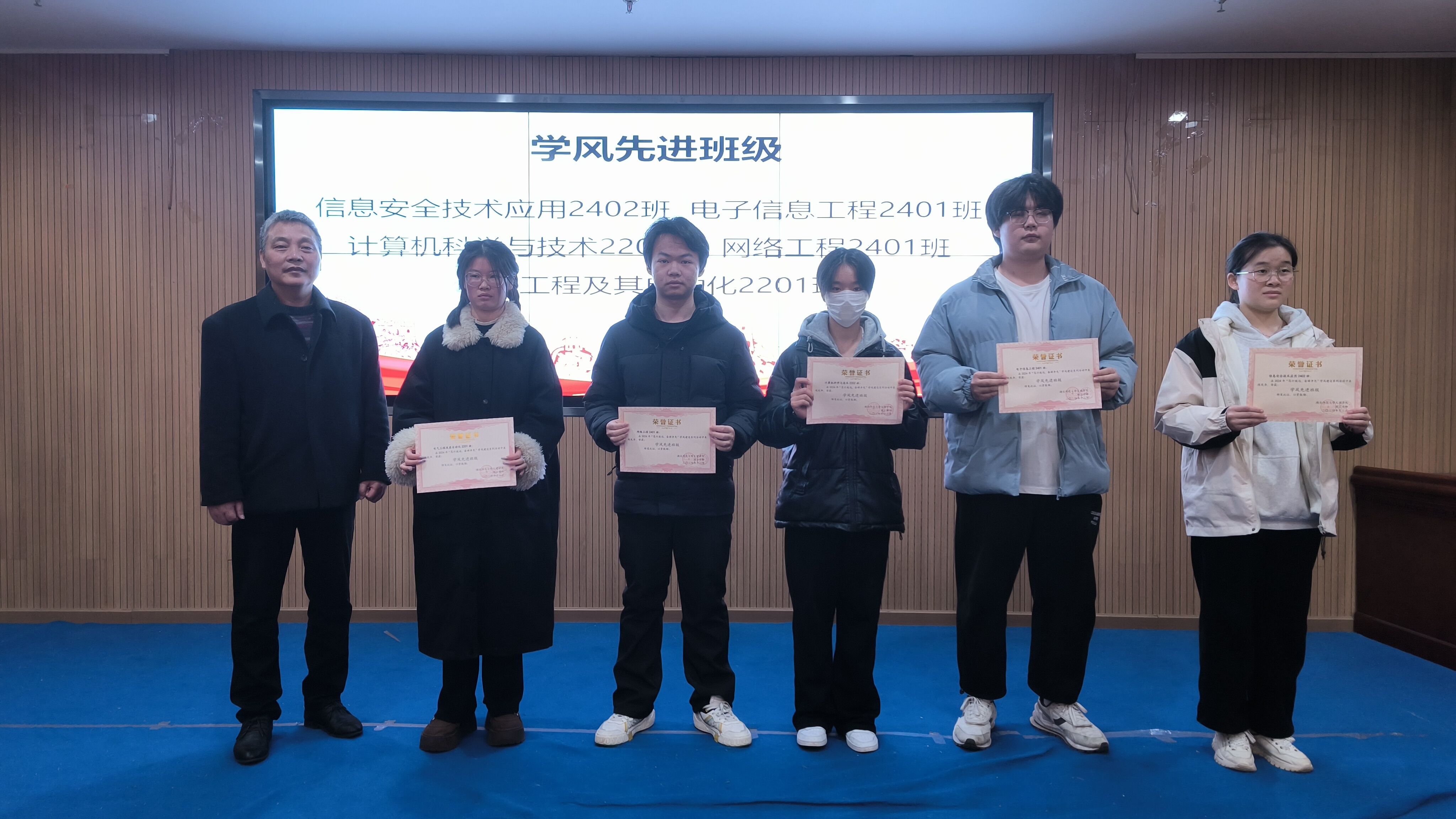 随后,学风建设系列活动表彰环节正式开始。现场气氛热烈,奖项依次揭晓。朱明亮老师率先上台,为“三字初赛得奖者”颁奖,肯定他们在书写技能上的深厚功底。接李晶老师颁发“帮扶先锋标兵”荣誉,赞扬同学们乐于助人的精神。董学良老师为“程序设计大赛一等奖”获得者颁奖,见证他们在代码世界的卓越表现。方婷老师则将荣誉给予“算法设计赛获奖者”,表彰其逻辑思维与创新能力。蒋万林老师、周磊老师先后为“学生手册知识竞赛优秀个人奖”得主颁奖,激励同学们对校园规范的深入理解。郭烨老师为“文明寝室”代表颁奖,赞许他们营造的良好生活环境。肖书记上台,为“学风先进班级”授予荣誉,彰显这些班级浓厚的学习氛围。潘主任为“学风进步突出班级”颁奖,鼓励大家持续奋进。最后,程主任为荣获“优秀组织奖”的班级颁奖,感谢他们为活动顺利开展的辛勤付出。