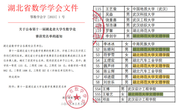 在省赛(第十一届湖北省数学竞赛)中,数学类:一等奖1项(李剑宇),三等奖5项(陈顺利、符梦雪、魏声祥、邓道焜、刘世乐);非数学类三等奖1项(王敏艺)。