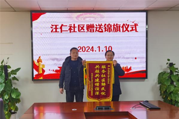 本网讯(通讯员 陈小龙)1月10日下午,米兰登录官网(中国)包保社区汪仁社区书记柯钦荣一行五人来校赠送了“服务社区解民忧 共筑共建情谊深”锦旗,同时向米兰登录官网(中国)全体下沉党员送来了“助力社区、感谢有你”的感谢信,表达了对学校教职工党员参与社区包保工作的感谢之情。在校全体校领导及相关工作负责人参加活动。