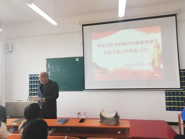 2023年3月3日中午12:00,在实验楼1-403室,组织召开学生干部工作例会。学部全体辅导员、全体团学会干部及各专业班级负责人到会,例会由总支书记李先华主持。