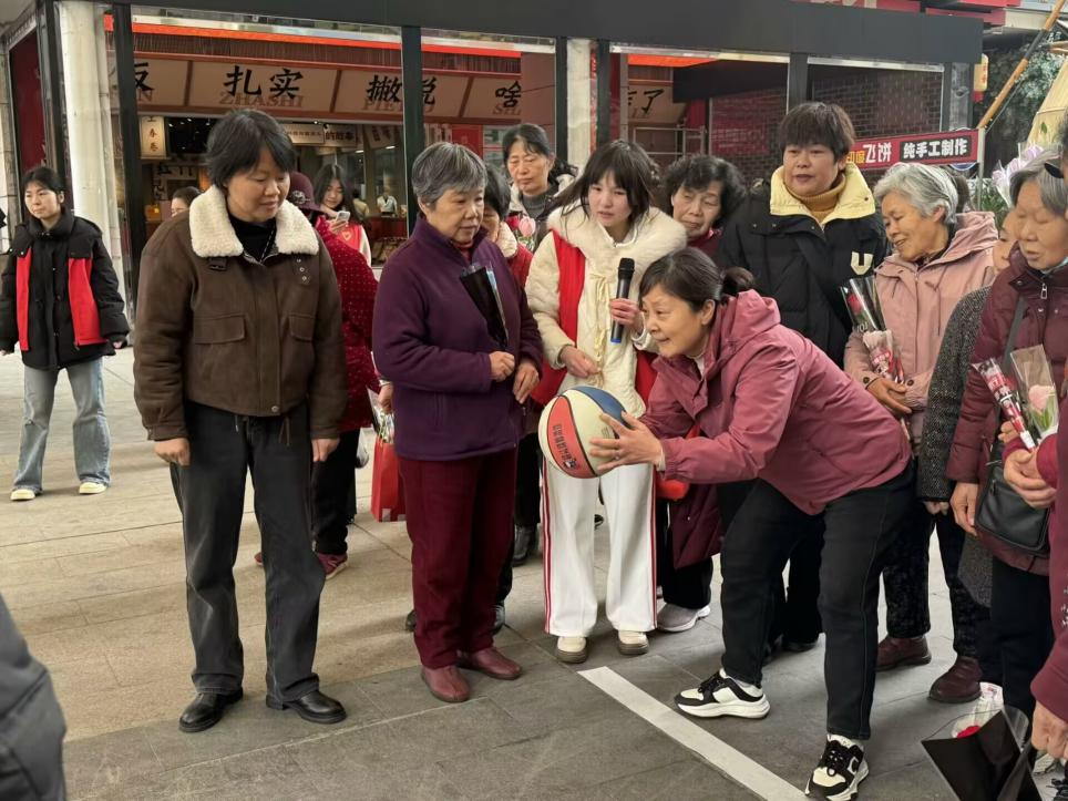 随后,各种小游戏和送花环节将活动气氛推向高潮。同学们发挥专业特色,手捧自制的上百朵手工鲜花,为社区的女性居民一一送上节日的祝福。接过鲜花的居民们脸上洋溢着幸福的笑容,她们纷纷表示,这不仅仅是一束花,更是社会对女性的尊重与关爱,让她们在这个特殊的日子里倍感温暖。一位收到花的老奶奶激动地说:“活了大半辈子,第一次收到这样的节日礼物,心里特别高兴,谢谢你们!”
