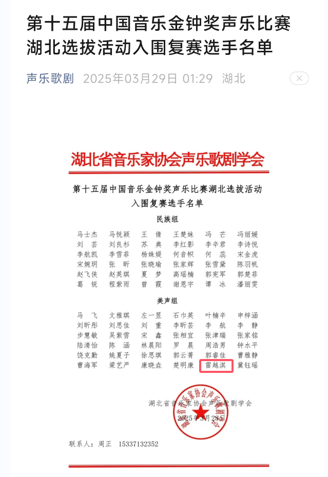 据悉,金钟奖复赛将于4月在江汉大学举行。雷越淇正全力备战,她表示:“无论结果如何,这次经历都将成为我音乐教育生涯的珍贵起点。未来,我希望能用舞台上的‘金钟之声’,反哺课堂,让更多孩子感受民族音乐的魅力。”